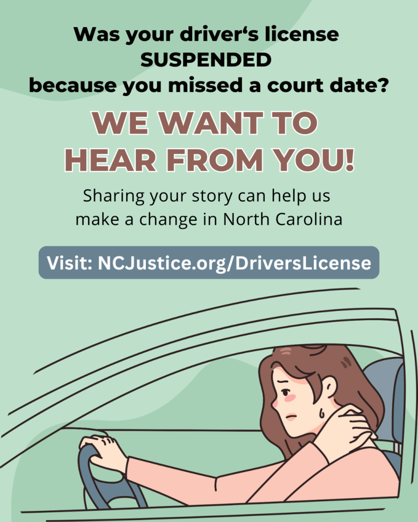 The North Carolina Justice Center is working on a statewide advocacy campaign focused on ending North Carolina’s practice of suspending a person’s driver’s license because of their inability to pay a traffic ticket or get to court.