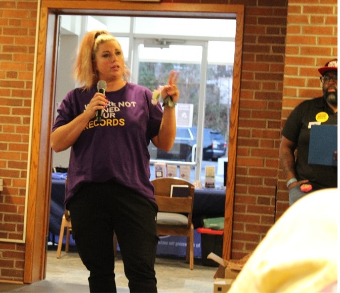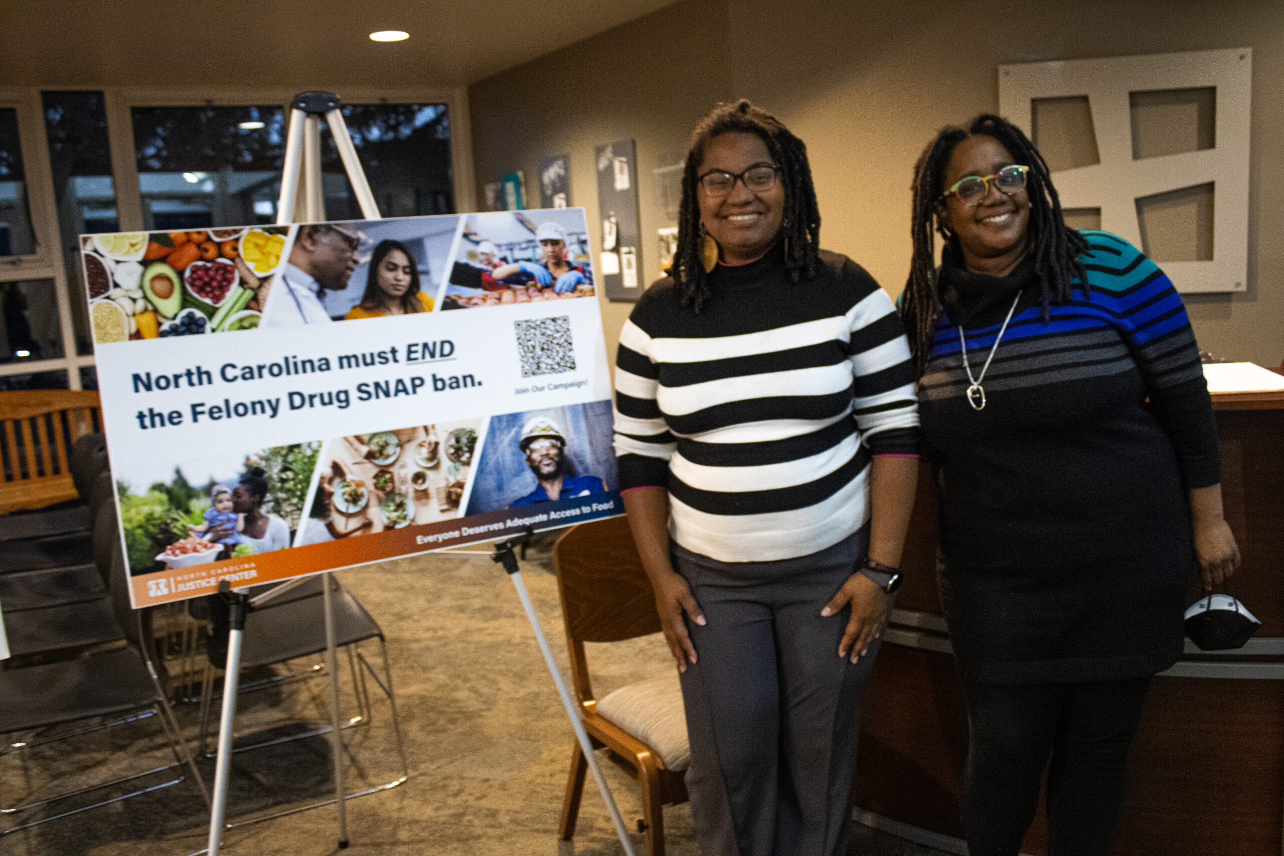 The panel discussion, which followed the screening, provided information about local and state efforts to overcome the strains on families that are created by the harmful policy. During the panel, Maria Rodriguez, one of the documentary participants, talked about what it meant to her to be excluded from SNAP for the rest of her life and why she decided to participate in the documentary. Jason Turnbull, representing Manna FoodBank based outside of Asheville, NC reminded those present that policies like the Felony Drug SNAP Ban create a significant strain on community resources, “for every SNAP application that’s denied, that’s one more family in the food line.” The other panelists were Ed Treat, Attorney at Pisgah Legal Services; Brent Bailey, Coordinator of the Buncombe County Local Reentry Council; and Laura Webb, Fair Chance Criminal Justice Project Director at NC Justice Center.