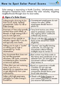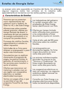 (Raleigh, NC – November 13, 2025) As solar energy becomes increasingly popular in North Carolina, it’s more important than ever to know the difference between legitimate programs and scams. The Preventing and Reporting Solar Scams document provides information on what to do if a scammer knocks on your door and when to contact the North Carolina Attorney General’s Office, the Federal Trade Commission, and the Consumer Protection Bureau. The document is available in both English and Spanish.