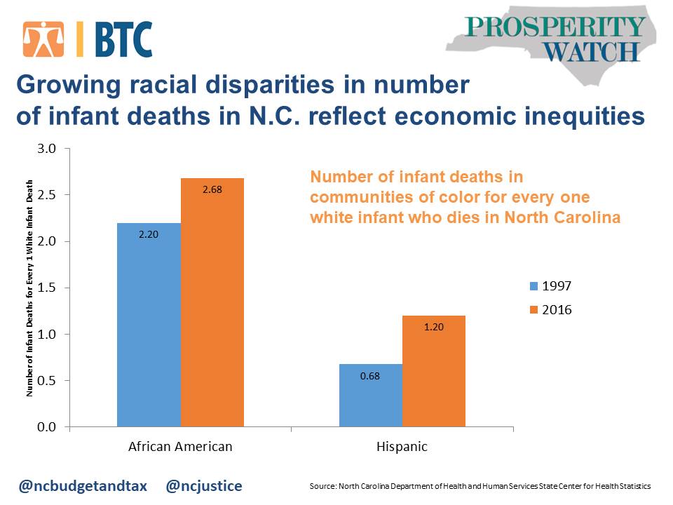 These growing gaps in infant mortality are rooted in disparate access to economic opportunities and resources that impact health. While two leading causes of infant death in the United States are attributable to preterm births and birth defects, the underlying root causes point to social factors such as family income, access to health care and insurance, access to prenatal care, mother’s education, and experiences of discrimination and systemic racism. Addressing and eliminating racial barriers to economic opportunity is a vital step in protecting infants and giving everyone in North Carolina the chance to live full and healthy lives.
